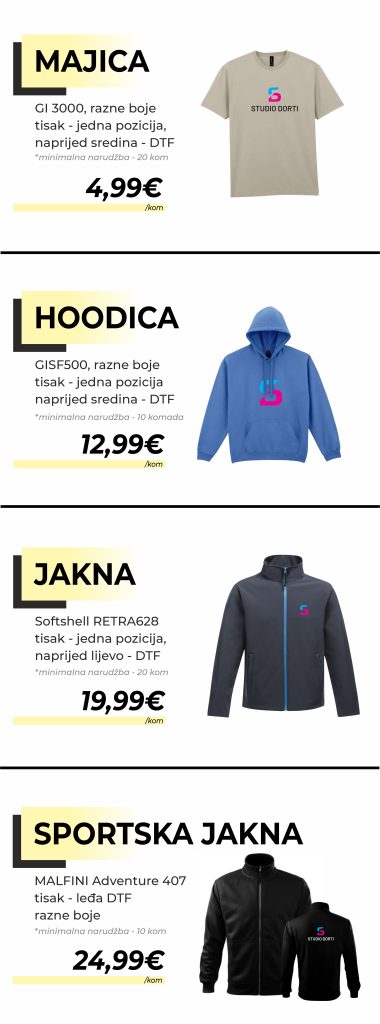 Ovaj mjesec u akcijskoj ponudi imamo majice, hudice, softshell jakne i sportske jakne raznih boja s DTF tiskom.